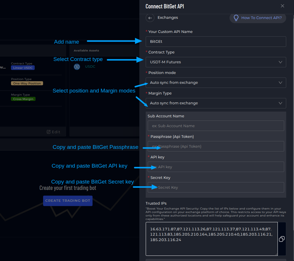 - Navigate to Exchanges → Connect Exchange → Bitget