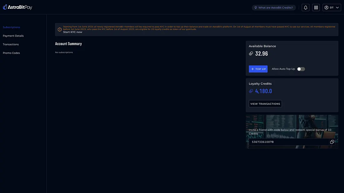 To thank early adopters, AstraBit will offer 20 platform credits to any existing user who completes KYC before September 1.